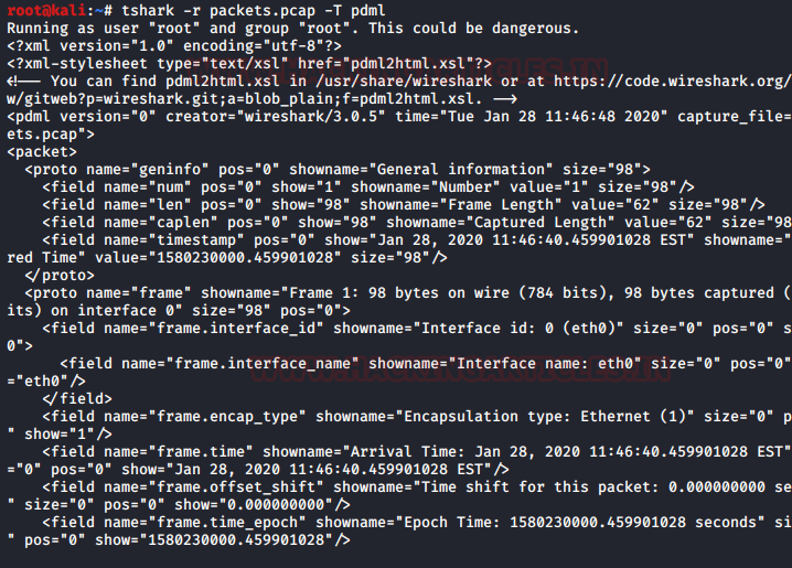 PDML stands for Packet Details Mark-Up Language which is an XML based. This information is quite equivalent to the verbose mode which we used earlier. And to have output in this format type the following command :