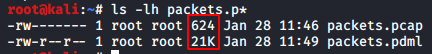 When we try to write the live data packets in a .pcap format file; we compress all that data packets in smaller segments. To better understand these data packets we need to decode them which leads to a difference in the size of the file and to check the size of any given file at the given moment use the following command :