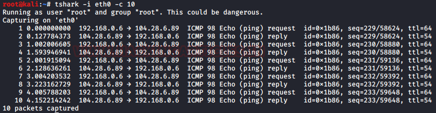 Let’s now try to capture traffic, we have various choice of interface to capture traffic and therefore one can choose whichever depending on their needs and requirement. But in our scenario, the interface which we are going to use is “eth0”. In order to capture traffic, we need to initiate one too as we are testing on a controlled network and for that use ping command and then to capture traffic we have to just specify the interface name by using -i parameter as shown in the image below :