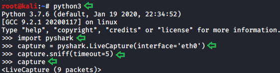 Now to get started, we need the python interpreter. To get this we write python3 and press enter. Now that we have the interpreter, the very first thing that we plan on doing is importing PyShark. Then we define network interface for the capture. Followed by that we will define the value of the timeout parameter for the capture.sniff function. At last, we will begin the capture. Here we can see that in the timeframe that we provided PyShark captured 9 packets.