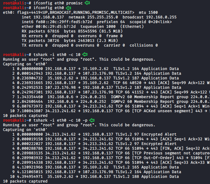 ifconfig eth0 promisc ifconfig eth0 tshark -i eth0 -c 10 tshark -i eth0 -c 10 -p |